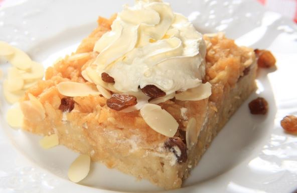 Pecite u rerni zagrejanoj na 200 stepeni oko 40 minuta. Pečen kolač izručite na tacnu naopako, tako da jabuke budu gore. Ukrasite listićima badema i po ukusu poslužite sa šlagom ili sladoledom od vanile.