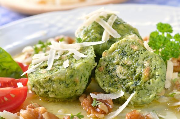 - Gotove knedle ocedite, složite u posudu za posluživanje i posipajte grubo narendanim parmezanom.