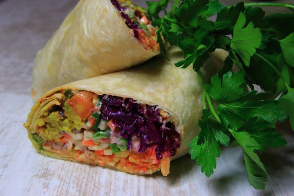 - Namažite smesu na bazi pasulj i avokada preko cele tortilje, te dodajte povrće.