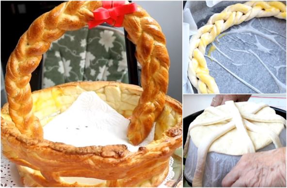 Premazati žumancetom i peći u rerni da porumeni na 200 stepeni oko 45 minuta. Pečenu korpu skinuti sa papira, zaseći nožem sa strane i ubaciti krajeve drške ili je samo "uglavite" u korpu.