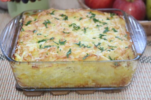 Sastojci: 200 g testenine, 2 krompira, 1 mala glavica crnog luka, 2 čena belog luka, 100 g sira, 200 g kiselog mleka, so, biber ulje, 2 jaja.
