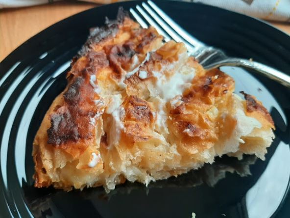 Priprema: Svaku koru namazati malo uljem i 1 kašikom sira i uviti i ređati u podmazan pleh u krug. Odozgo malo premazati uljem. Peći na 200 stepeni C oko 25 min. U kiselo mleko nadrobiti 3 čena belog luka. Pečenu pitu premazati i vratutu u rernu oko 10 min.