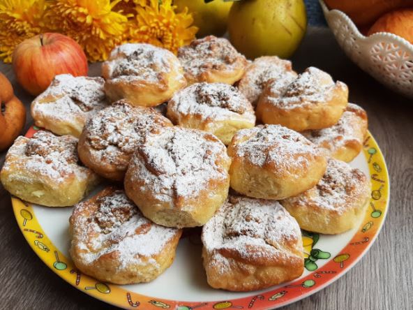 Pokriti da odmara pola sata. Razviti 1 cm debljine i vaditi sa čašom male krugove. Umutiti belance sa malo prah šećera i dodati u mlevene orahe i izmešati. Vaditi kašičicom i stavljati na sredinu kruga testa skupiti sa svih strana i stavljati u pleh. Peći na 200 stepeni oko 35 min. Posuti prah šećerom i vanilin šećerom.