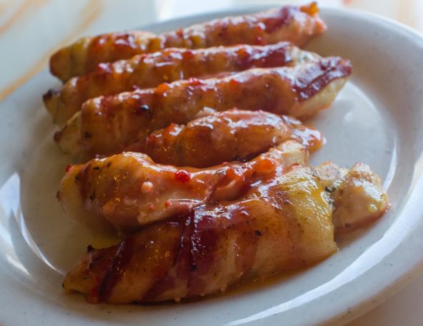 - Sve dobro izmešajte i ovom smesom premažite sa svih strana pileće štapiće u slanini.