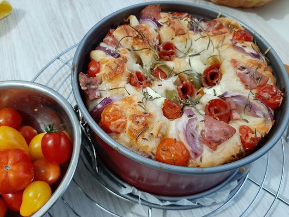 U testo ubaciti šećer, suvi vrat paradajz sečene na pola beli luk sečen na četvrtine.. Premazati uljem, iskidati ruzmarin pa pobacati preko pogače, krupnu so, kim. Peći na 200 stepeni C 35 min.