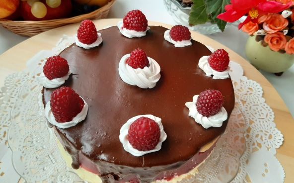 Preko njega puding od vanile i odozgo poređati ostatak piškota. Ostaviti pokriveno folijom da prenoći ili 3-4 sata da se stegne. Istresti na tanjir pa tortu preliti čokoladom.. Može se ukrasiti šlagom i malinama.