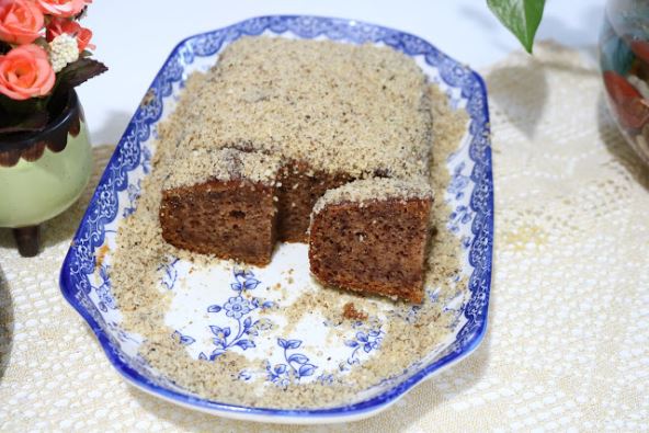 Potrebno je: 200 gr brašna; 100 gr šećera; 100 gr oraha + 50 gr; 400 ml kisele vode; 2 kašike džema; 1 prašak za pecivo.