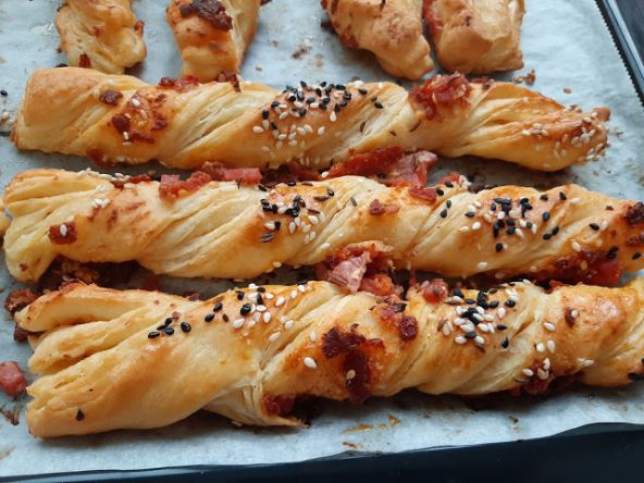 Testo nožem preseći na pola pa staviti jedu polovinu na drugu. Dobro oklagijom istanjiti, premazati sirom i pavlakom i posuti seckanom šunkom. Iseći na trake širine 1 cm, pa svaku traku uviti i ređatu u pleh. Pokriti, a rernu uključiti na 200 stepeni C.