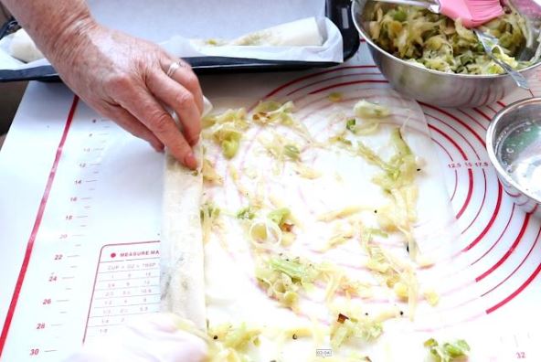Priprema: Na ulju propržiti na kolutove iseckan praziluk, pa dodati narendan krompir. Na kraju dodati so i biber. Jednu koru raširiti na sto pa je poprskati kiselom vodom i rasporediti nadev. Uviti u rolnicu, pa ponoviti postupak sa ostalim korama.