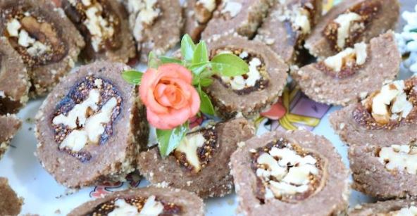 Sastojci: 250 g šečera, 50 ml vode, 150 g mlevenih oraha, 50 g keksa, 50 g posnog margarina, 1 štangla otopljene čokolade, 200 g smokava, 100 g oraha u jezgru, malo mlevenih oraha za valjanje.