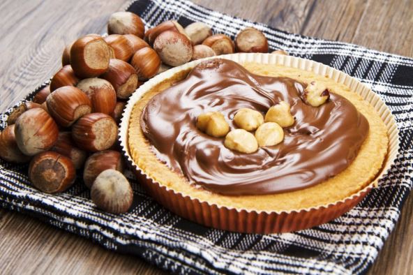 Preliti preko ispečene kore i ostaviti da se dobro ohladi u frižideru. Ukrasiti čokoladnim topingom i lešnicima.