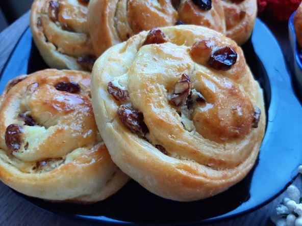 Preko maslaca premazati sir u koji ste dodali 2 kašike šećera i 1 vanilin šećer. Posuti suvim grožđem. Uviti u rolat i seći na rolatiće debljine oko 2 cm.