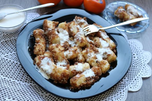 Priprema: Skuvati krompir u ljusci, a potom ga oguliti. Odmah ga izgnječiti dodati soli, žumance, sir i brašno i umesiti glatko testo iseći na komadiće i valjati u male valjke kao na slici.