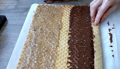 Na oblandu na jednu polovinu po dužini namazati svetli, a sa druge strane čokoladni deo. Uviti i sastaviti rolnice na sredini oblande.