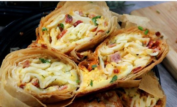 Sastojci: 100 g testenine, 100 g sira, 100 g kisele pavlake, 100 g seckane šunke, 2 jaja, 2 kašike griza, peršunov list, ulje, tanje gotove kore.