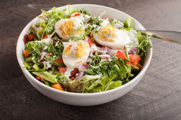 Sastojci: 100-120 gzelene salate, 30 g rukole, 100 g tunjevine, 1 paradajz, 1 krastavac, 1-2 tvrdo kuvana jaja, 5 kašika maslinovog ulja, malo balzamiko sirćeta, so po ukusu, 4 kašike majoneza, 1 kašika suvog peršuna, 3 kašike soka od limuna.