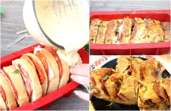 Priprema: Isečen hleb premazati kečapom, poslagati u uski kalup ili pleh pa između poređati listove kačkavalja i šunke. Može malo i dimljene kobasice ili šta već želite od suhomesnatog. U pavlaku dodajtejaja, jogurt, origano, biber i sve izmešajte.