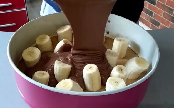 Bananama odsecite vrhove, pa ih iseckajte na komade dužine oko 3 cm i poređajte uspravno u okrugli pleh podmazan puterom. U umućenu smesu dodajte kašiku sirćeta, promešajte kašikom, pa prelijte preko banana.