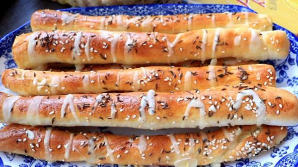 Zamesiti na stolu, pa iseći na šire trake i uvijati u tanke valjke. Ređati u pleh koji ste obložili pek papirom. Pokriti da porastu pa ih premazati žumancetom. Posuti sa malo susama i peći oko 15 minuta na 220 stepeni.