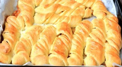 Iseći nožem za picu šire trake i uviti malo. Ređati u podmazan pleh. Ostaviti pokriveno 20 min, pa premazat po želji žumancetom i peći na 200 stepeni C oko 25 min.
