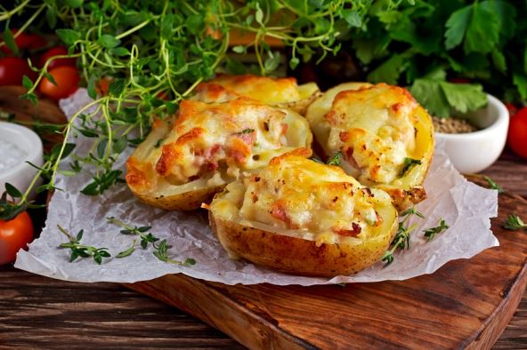 Priprema: Krompir u ljusci dobro oprati i osušiti, staviti u pleh i probušiti viljuškom na nekoliko mest. Preliti krompir maslinovim uljem, posloliti i staviti da se peče na 180 stepeni jedan sat. Krompir izvaditi iz rerne, preceći po dužini i kašikom, ali tako da ljuske ostanu cele i izvadi iz ljuske unutrašnjost krompira.