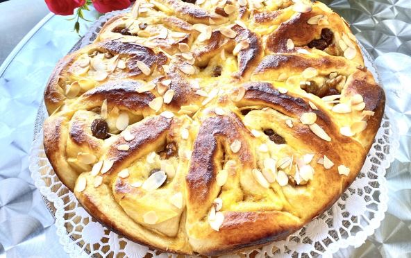 Zatim na svaku od traka dodavati prvo suvo groždje, zatim orahe i na kraju jabuke. Uviti u valjak, seći jufkice, položiti ih u pleh, premazati žumancem, posuti bademovim listićima, sačekati još 20 minuta da naraste i peći na 180 stepeni 30-35 minuta.
