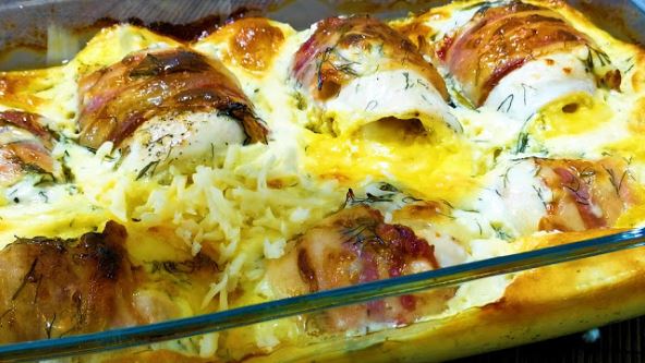 Priprema: Pileće grudi istući tučkom za meso pa posuti solju i biberom. Pomešati seckani beli luk i senf, pa namaziti piletinu tom mešavinom. Staviti komade kačkavalja i urolati. Tako pripremljeno meso uviti u slaninu. Staviti u pleh.