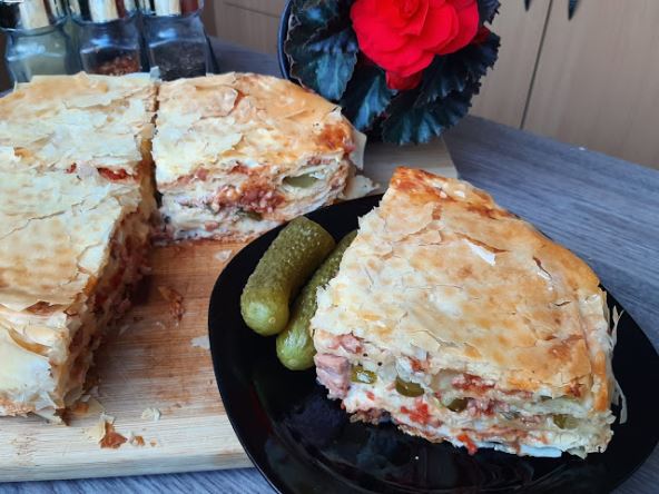Obložite tepsiju pek papirom, malo je premažite uljem pa ređajte red kora sa malo ulja, sledeću premažite sirom, preko nje koru koju premažete opet sirom i pobacate suhomesnato, kao i seckane kisele krastavčiće.