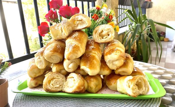 Priprema: Testo umesiti da bude glatko i vazdušasto. Podeliti na četiri jufkice. Svaku jufkicu razvući u krug, iseći na osmine. Svaku osminu namazati filom i uvijtati u kiflice. Ponavljati proces dok imamo testa. Kiflice premazati žumancetom, posuti susamom i između njih staviti nasumično kockice margarina ili putera.