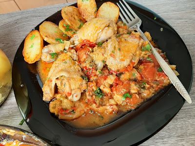 Priprema: Na ulju propržiti sitno seckan mladi luk, pa dodati papriku sečenu, tikvicu na kockice i malo prodinstati. Ubaciti piletinu i dinstati sa dodavanjem malo vode. Kad piletina omekne ubaciti na kocke oljušten paradajz , začin, biber so i na kraju peršunov list..
