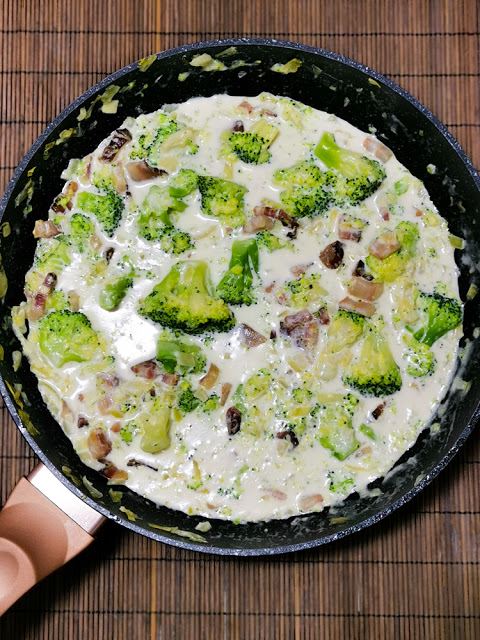 Potrebno je: 200 gr slanine; 1 luk; 400 gr borokolija; 5 čenova belog luka; 250 ml pavlake za kuvanje; 150 gr mocarele; 70 gr parmezana; so;
