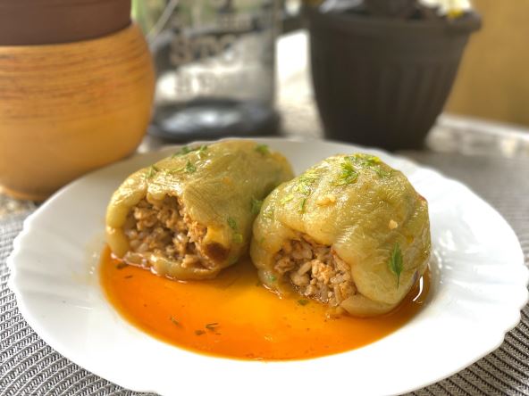 Sastojci: 5 svežih paprika za punjenje, 1kg pilećeg mlevenog mesa, 200gr obarenog pirinča, glavica crnog luka, jedan mladi beli luk, 1 paradajz, 1 izrendana šargarepa, ulje. Od začina: so, biber, suvi začin, beli luk u granulama, slatka začinska paprika, malo svežeg peršuna.