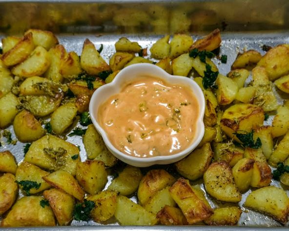 Napravite sos tako što ćete pomešati kečap i majonez, sok od krastavčića i seckane krastavčiće. Kada je krompir gotov vratite u njega ruzmarin i beli luk koji ste procedili, i pospite peršunom, pa služite uz sos.