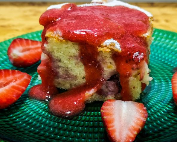 Potrebno je: 3 jaja; 150 gr šećera; 250 ml kisele pavlake; 100 ml ulja; ekstrakt vanile; 250 gr brašna; prašak za pecivo; so; 500 gr jagoda;