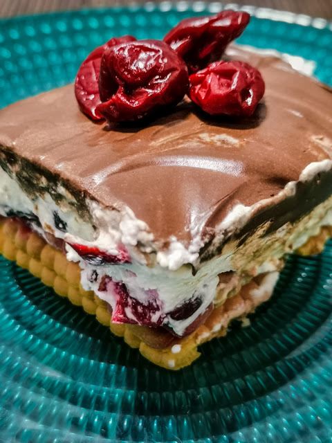 Priprema: Umutiti slatku pavlaku i šećer. Pretvoriti u šlag. U mleko umakati keks (po 3 komada odjednom), dobro ih natopiti. Ređati u posudu za pečenje. Preko toga dodati višnje. Ravnomerno rasporediti i preko toga razmazati šlag koji smo umutili. Preostalu pavlaku zagrejati i u nju istopiti ili čokoladu ili kakao. Ohladiti malo krem i preliti preko kolača.
