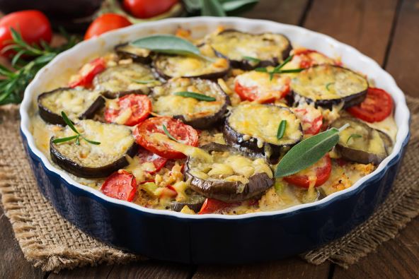 Operite i očistite svo povrće od semenki. Oljuštite patlidžan, isecite na kriške i posolite. Krompir isecite na kružiće i poređajte ga po dnu posude za pečenje podmazane maslinovim uljem.