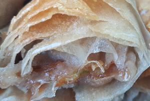 Prvu koru raširiti, premazati malo uljem, tako i drugu. Na kraj u dnu staviti nekoliko kašika fila, saviti krajeve i uviti u rolnicu.