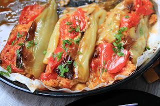 Priprema: Oslića posoliti i uvaljati u kukuruzno brašno i ispržiti u ulju. U tom ulju ispržiti sitno seckan crni i beli luk i skloniti sa vatre. Pirinač obariti.. U luk dodati začinsk pariku, biber, so, začin. Ubaciti pirinač i izmešati. Ribu rukama isitniti odvojiti ako ima kosti i izmešati sa pirinčom. Dodati seckan peršunov list . Paprike očistiti od semena i iseći po dužini. Kašikom puniti nadevom i preko poslagati krugove paradajza . Ostatak paradajza naseći pored paprika. Premazati paprike uljem i peći na 220 stepeni C oko 50-60 min.