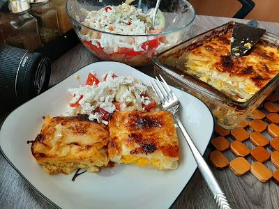 Priprema: Tepsiju premazati oblno uljem. Krompir iseći na listiće pa ga posoliti i pobiberiti i dodati malo ulja. Izmešati. Poređati na dno pola krompira pa iseći na krugove kuvana jaja, posoliti ih. Odozgo drugi deo krompira. U činiju razbiti jaje, dodati jogurt 30 ml ulja i mleko pa dobro izmešati. Preliti krompir i izrendati odozgo kačkavalj. Peći na 210 stepeni C oko 50 minuta.