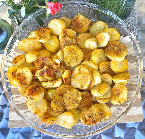 Sastojci: 1,5 kg polu-obarenog mladog krompira, 50ml ulja, 2 kašike kukuruznog brašna, so, ruzmarin, beli luk u prahu, slatka začinska paprika, suvi začin