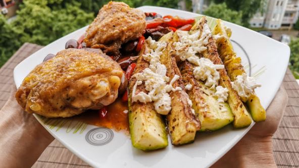 Priprema: Pomešajte brašno, dimljenu papriku, origano, so i biber, pa uvaljajte piletinu i pržite dok ne dobije boju. Sklonite meso i na ulje dodajte na trake isečene paprike i crni luk. Dodajte beli luk, suve šljive, masline, crveno ili belo vino, pileći temeljac ili bilo koju supu. Vratite meso, poklopite i kuvajte 20-30 minuta. Za miks začina koji će da ide preko tikvica pomešajte, so, biber, ruzmarin, origano, beli luk u prahu i cimet.