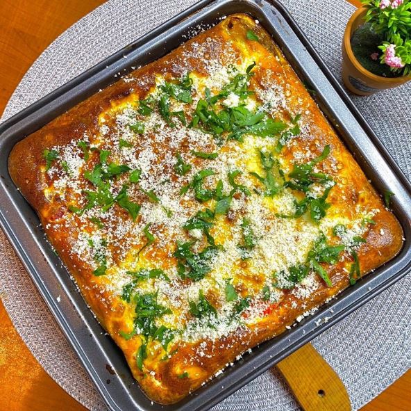 Priprema: Umutiti jaja, dodati prašak za pecivo, posoliti, staviti pavlaku i sjediniti. Pouljiti pleh, pa naredjati po dnu paprike, preko njih staviti kačlavalj pa preliti prethodno umućenom smesom. Ponavljati proces dok imamo materijala. Peći na 200 stepeni, 20-25 minuta. Prijatno!