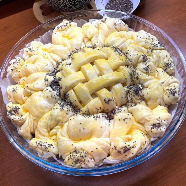 Priprema: U toplo mleko staviti izmrvljen kvasac, kašičicu šećera, dve kašike brašna. Promešati i pustiti kvasac 5-10 minuta da se aktivira. Dodati jedno jaje, promešati pa dodati brašno. Umesiti glatko testo. Podeliti na 11 jufkica. Svaku premesiti. Jednu jufku staviti u centar posude za pečenje. Zatim dve jufkice iskoristiti za sečenje trakica. Trakice redjati preko centralne jufkice. Ostatak jufkica seći po sredini i praviti oblik lista. Redjati u krug. Premazati žumancem i po želji ukrasiti semenkama. Peći na 200 stepeni 30-35 minuta. Prijatno!