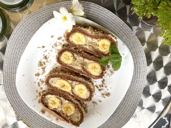 Priprema fila: Mleko presuti u šerpu, i početi sa kuvanjem. Dodati šećer i vanilicu i lagano kuvati. Staviti i brašno i uz neprestano mućenje nastaviti kuvanje dok se smesa ne zgusne. Izmiksirati margarin i prah šećer, pa postepeno dodavati skuvanu smesu uz miksiranje. Po želji možete dodati i još mlevenih oraha. Fil ravnomerno mazati preko kore, pa staviti banane. Uviti u rolat. Premazati filom i dekorisati po želji. Odneti na hlađenje. Prijatno!