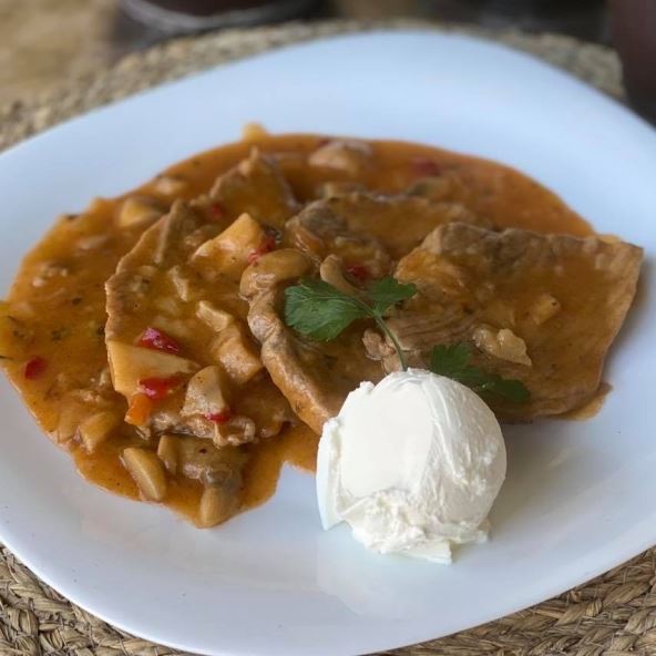 Priprema: Tanko isečene šnicle posoliti, pobiberiti i u malo zagrejanog ulja propržiti samo da dobije boju. Zatim ih odložiti sa strane. U isto ulje staviti sitno iseckan luk i propržiti. Zatim dodati, papriku, paradajz pastu i pečurke. Začiniti, dodati brašno, naliti vodom i nastaviti kuvanje. Nakon toga vratiti prvobitno propržene šnicle u sos, dodati još malo vode i kuvati zajedno desetak minuta. Prijatno!