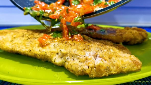 u trećem izmutite jaja, posolite i pobiberite meso. Spremite sve za pohovanje. Uvaljajte prvo u brašno, zatim u jaja, i na kraju u prezle i timijan. Pržite na masti, dodajte beli luk u tiganj i malo putera. Gotovo meso odložite u tanjir. Iscedite limun. Dodajte kisele paprike i na kraju seckan peršun. Prelijete sos preko mesa i servirajte.