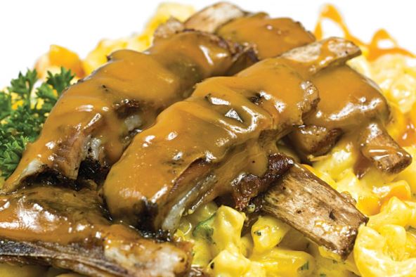 Crni luk isecite i propržite na zagrejanom maslinovom ulju. Dodajte jagnjetinu i celer isečen na listiće. Nalijte vodom i kuvajte 30 minuta. Izvadite meso na tanjir, u šerpu dodajte senf, promešajte i zgusnite brašnom pomešanim s malo vode. Jagnjetinu servirajte uz ranije obaren krompir i prelijte saftom.