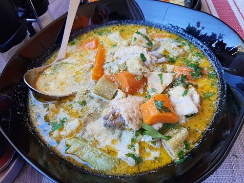 Potrebno je: 500 g pilećeg mesa, 4-5 bamija, 2 šargarepe, 1 manja glavica crnog luka, 1 manji celer, cvetovi karfiola i brokolija, 1 žumance, 1 veća kašika pavlake, so, biber, ulje, peršunov list.