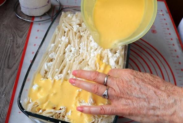 Svaku koru skupljati kao harmoniku i ređati po dužini u pleh. Između nabora ugurati sir sa svih strana. Preliti kiselim mekom i protresti da padne između nabora. Peći na 200 stepeni oko 50 minuta da lepo porumeni.