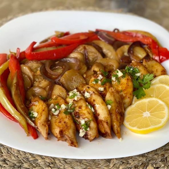 Priprema: Povrće iseći i začiniti po ukusu, zatim ga pržiti na maslinovom ulju 10-12 minuta. Zatim povrće izvaditi i u isti tiganj staviti lignje. Dodati soja sos i suvi zacin. Prziti oko 10 minuta. Preliv za lignje napraviti tako sto cemo iseci beli luk i peršun, ocediti polovinu limuna, sve sjediniti i dodati maslinovo ulje i malo soli. Prijatno!